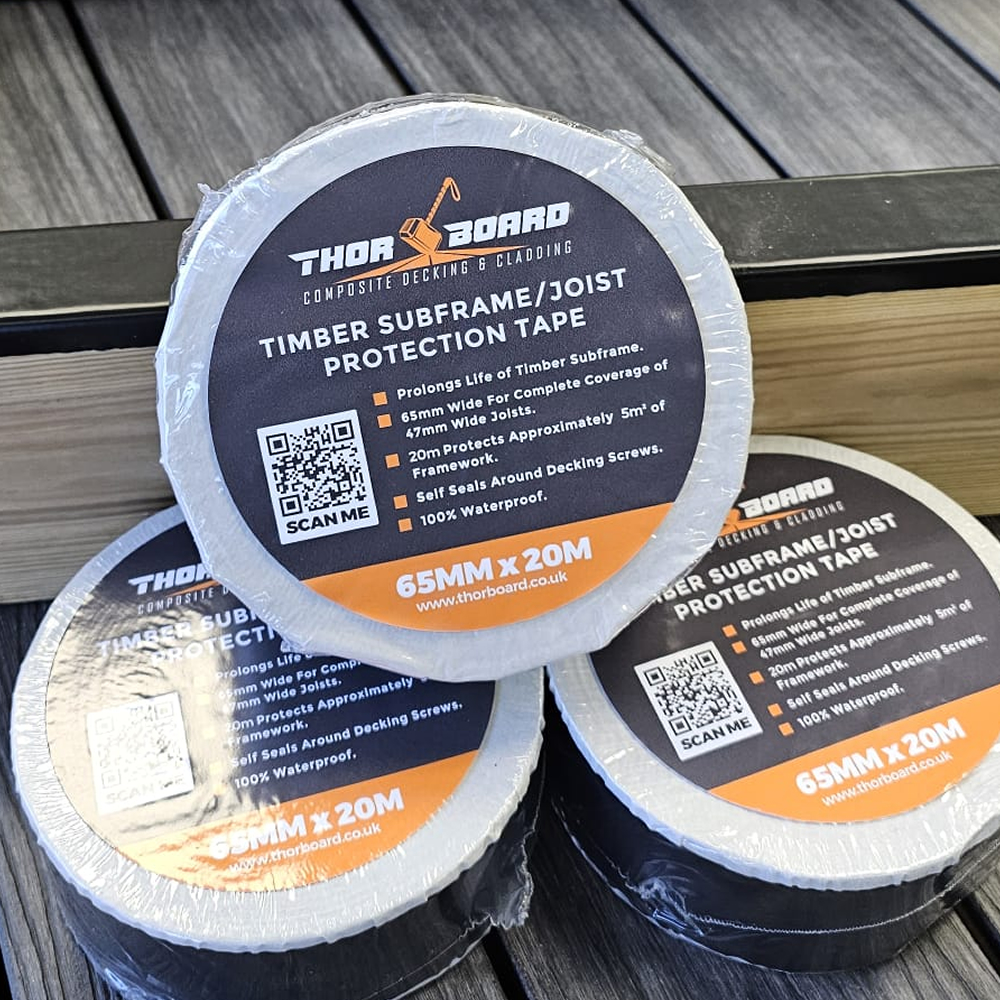 When investing in a decking project, protecting the subframe is just as important as choosing the right decking boards. Over time, moisture can cause timber joists to rot and decay, significantly reducing the lifespan of your deck. Many joist protection tapes on the market are only 50mm wide, which fails to fully cover and protect standard UK timber joists. That’s where our Decking Subframe/Joist Protection Tape comes in—at 65mm wide, it provides superior coverage and an extra layer of defence to ensure your decking lasts for years to come.